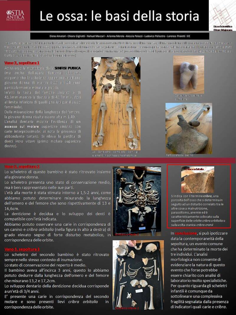 Il liceo scientifico Majorana ha realizzato tre poster, le pubblicazioni di grande formato che vengono presentate ai convegni e alle giornate di studio. Ciascun gruppo di lavoro ha potuto in questo modo sviluppare le competenze per presentare una scoperta antropologica o una nuova interpretazione scientifica presso un'ipotetica platea di studiosi, come avviene realmente per chi intraprende la strada della ricerca. I ragazzi sono stati seguiti dall'antropologa Paola Francesca Rossi.